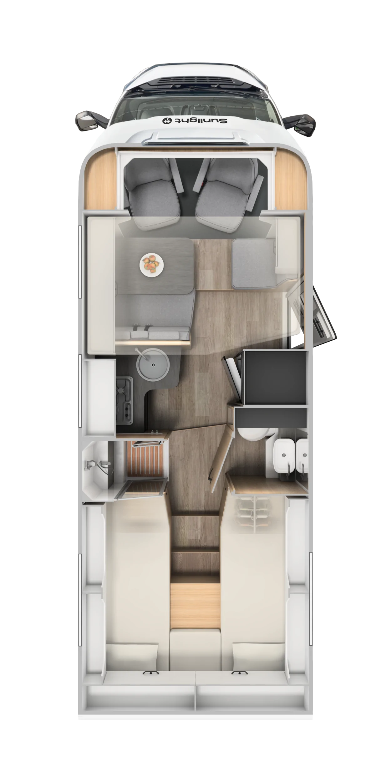 Alle Camper sind mit einer Küche, Kühlschrank, Gasherd, Heizung, einer Nasszelle* mit Waschbecken, Dusche und Toilette ausgestattet.